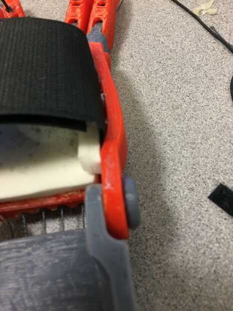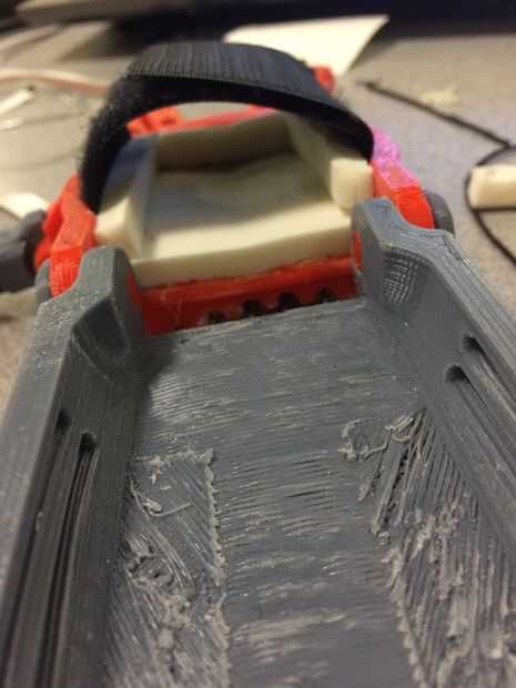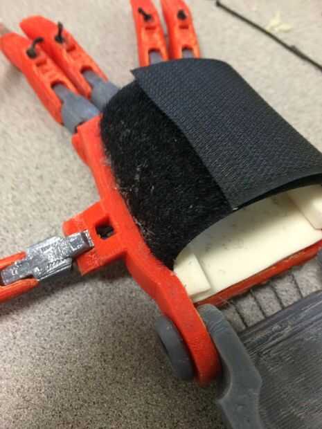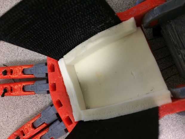 Con la pistola de pegamento caliente, coloque el relleno y el cierre de velcro en la palma como se muestra. En primer lugar, aplique el pegamento caliente a la palma (no el velcro) de tal manera que el pegamento no toque las cuerdas inelásticas en los canales. Antes de que el pegamento se refresca, presione el lado del lazo suave de una tira de velcro sobre el pegamento caliente. De manera similar, se aplica pegamento caliente a la palma y presione el lado de la tira de velcro sin el gancho en la cola. Corte pedazos de tamaños adecuado de espuma, pegue el relleno a todas las superficies en el interior de la palma.