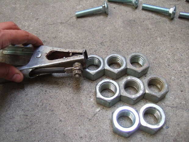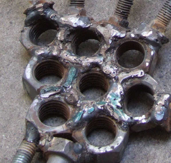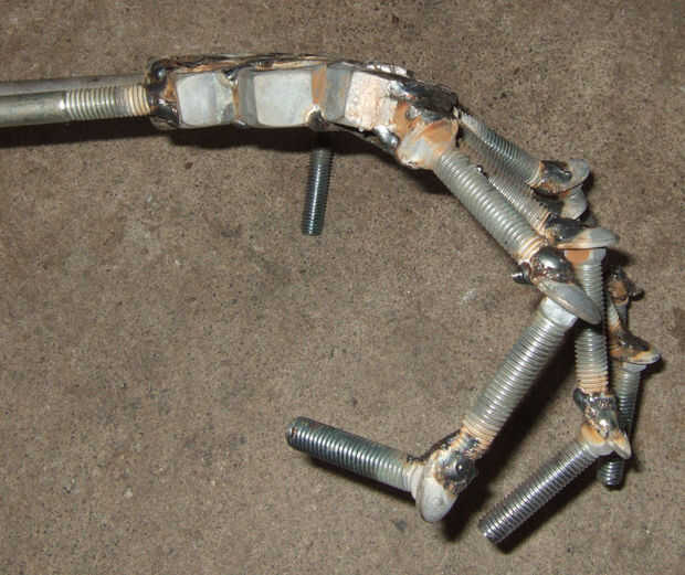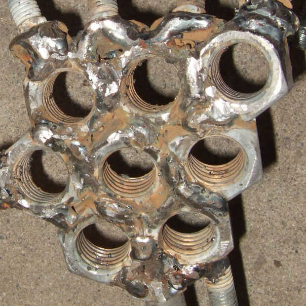 hice la palma ligeramente curvada para las miradas. Esto fue un poco más complicado que una palma totalmente plana. Primera línea de las tuercas hexagonales en filas como se muestra. Soldar con autógena juntos cada fila plana. Después, se soldarán una fila a la siguiente mientras que se sostiene en un ángulo ligero para conseguir una palma curvada.