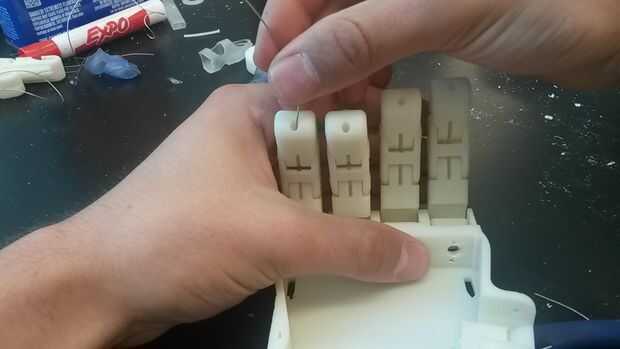 Los hilos de alambre hacia abajo a través de los dedos. Tensar el cable para que el extremo engastado asiente bien en la yema del dedo.