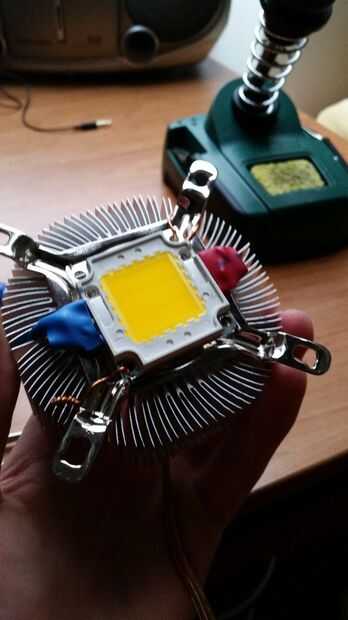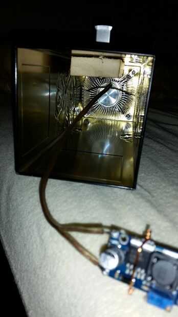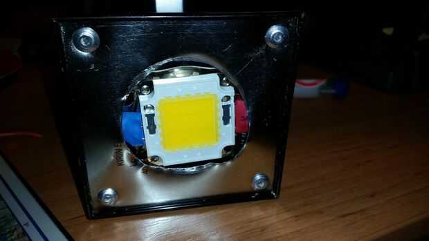 Montar el LED en el disipador térmico con alambre esmaltado, lo escrito arriba, soldar algunos cables audio cobre trenzados, utiliza un montón de tubería de encogimiento de calor y doble comprobado no cortos, como nuestro powerpack probablemente derretiría toda la soldadura con duro poco, porque su cortocircuito corriente puede ir tan alta como 6A por la célula. Y 90amps es mucho. El alambre entonces se pega entre las aletas dobladas a los lados, para aliviar en parte la tensión que podría desear para rasgar los cables de lo LED. Agujeros perforados en la parte inferior de la caja, pero ten cuidado. El pedacito de taladro circular es muy mala idea para esto. Había cansado, y una vez que se rompió a través en un lado del metal, se dobló en la parte que todavía fue conectada con el resto y se atornilla todo el agujero. Me alegra que pude rescatar parcialmente con solicitud y paciencia. Porque no era capaz de encontrar ninguna buena tornillos y tuercas para que coincida con el disipador térmico y los agujeros, yo simplemente lo clavan, y OMI parece mejor que los tornillos. Lleva a cabo muy resistente, y el disipador de calor ajusta perfectamente el tamaño de esta caja, como no toque ninguno de los lados. Se puede ver en las imágenes adjuntas. También es importante que el led está tan cerca del agujero de apertura posible, para evitar la inundación de gran angular.