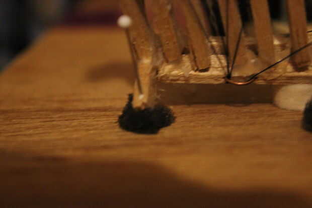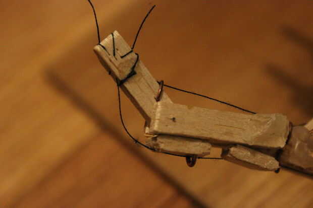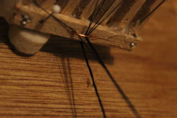 Usted debe obtener cerca de 10 pulgadas de cadena para cada tendón, que necesita exactamente diez cuerdas. Para este paso se necesita un hilo y aguja, primer hilo un trozo de hilo por cada uno de la Guardia rieles para cada dedo. en la punta del dedo que desea pasarlo a través de la madera por lo que no viene suelto como en las imágenes de abajo. Hacer esto para cada uno de los dedos (para ser exactos 2 tendones de cada dedo, uno arriba uno abajo) cuando usted tiene su conjunto de los 10 trate de usar la mano como una marioneta para probar si funcionan las articulaciones.