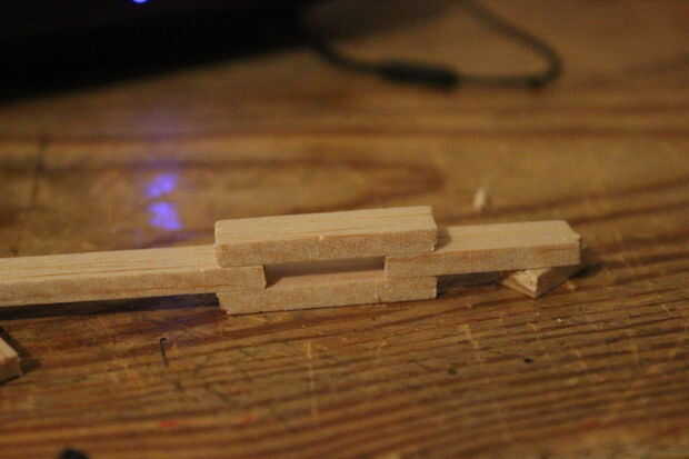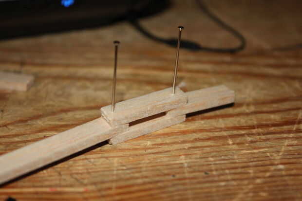 2. pensar en las piezas de doce 1 pulgadas como los dígitos fuera del dedo indicador, medio, anillo y meñique. Luego pensar en el pedazo de 1 3/4, la pieza de 15/16 y las piezas de 14/16 como los dígitos internos del dedo. (los más cercanos a tu mano) Veces causa voy a mostrarte cómo hacer un dedo y a hacer lo mismo para el resto :) ahora línea las piezas para arriba como en la foto y luego empuje los pernos en balsa en los puntos de conexión, ejemplo en la foto de abajo. todo esto es sin incluir el pulgar.
