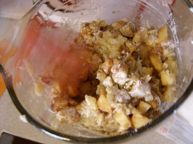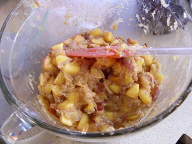 Cocinar el relleno hasta que se espese y los melocotones suavizan pero no pierdan su forma. El relleno se cocine más en el horno, así que asegúrese de no colocar el relleno en pasta. Tardó unos 5-6 minutos en mi horno de microondas, pero puede tomar más o menos para usted. Comprobar cada dos minutos revuelve y ver cómo está llegando a lo largo.
