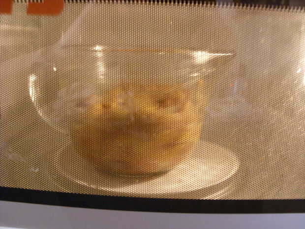 Puesto que los pies son pequeños, el relleno no completamente cocido por el tiempo que la corteza se hizo. Así que tenemos que cocinar el relleno un poco de antemano. Mina cociné en el microondas para no tener que conseguir un pote sucio (sí, soy perezoso), pero se puede cocinar tuyo en la cocina si quieres.