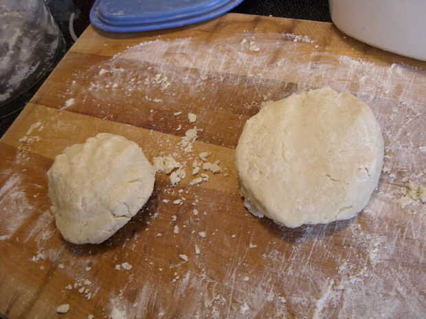 Volcar el contenido de la procesadora de alimentos sobre una tabla enharinada cortar, juntar la mezcla en una pasta. Dividir la masa en dos partes y formarlos discos.