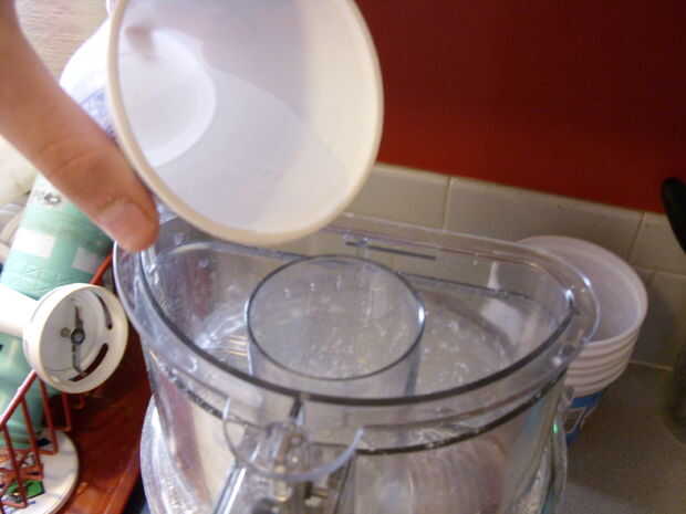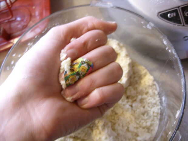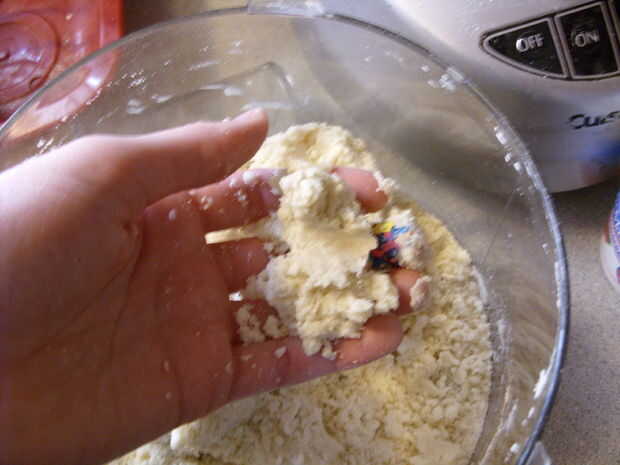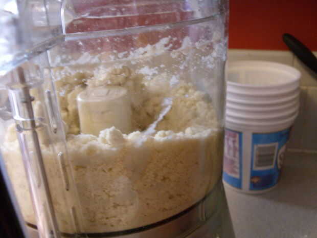 Poner la harina, manteca y mantequilla en el vaso de la procesadora de alimentos. Pulse picar hasta que la mantequilla y la manteca son que del tamaño de pequeños guisantes y la mezcla es grumosa. (Ver fotos). Con la procesadora funcionando, poco a poco Vierta en el agua fría. Añadir agua suficiente para que la mezcla se confluye en una buena pasta al apretar en la mano.