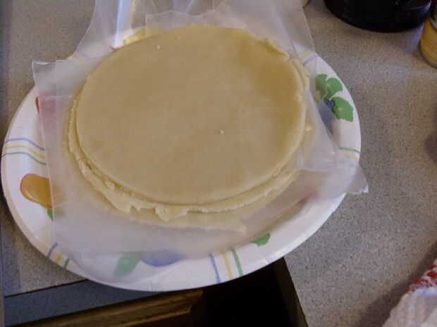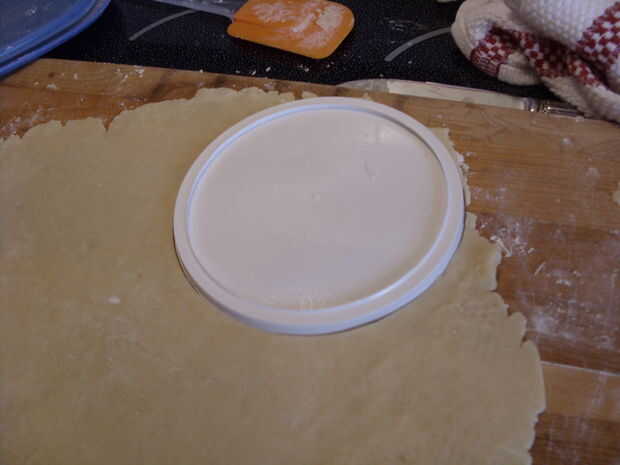 Cuando la masa es aproximadamente 1/8 pulgadas gruesa y corte hacia fuera de los círculos de masa. He utilizado una tapa de un envase de Cool whip como mi plantilla. Si quieres tus pies al ser más pequeño, usar una plantilla o una tapa más pequeña. Al apilar para arriba los círculos sobre una placa, asegúrese de que hay un pedazo de papel encerado o envoltura de plástico entre cada uno. Si la masa se ha convertido en demasiado caliente o es rasgado fácilmente, ponerlo en la nevera a enfriar durante un rato antes de armar las empanadas.