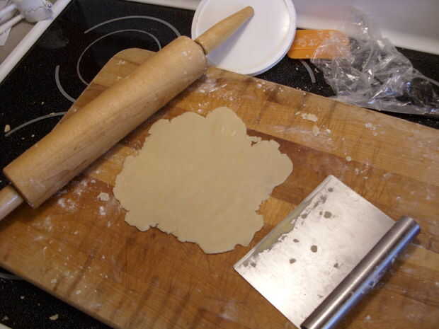 Harina de su rodillo y tabla de cortar muy bien. Tomar uno de los discos de masa y coloque en una tabla de cortar. Espolvorear un poco de harina encima del disco por lo que no hay riesgo de stickage. Deje cualquier masa no está utilizando en la nevera hasta que esté listo para rodar hacia fuera.