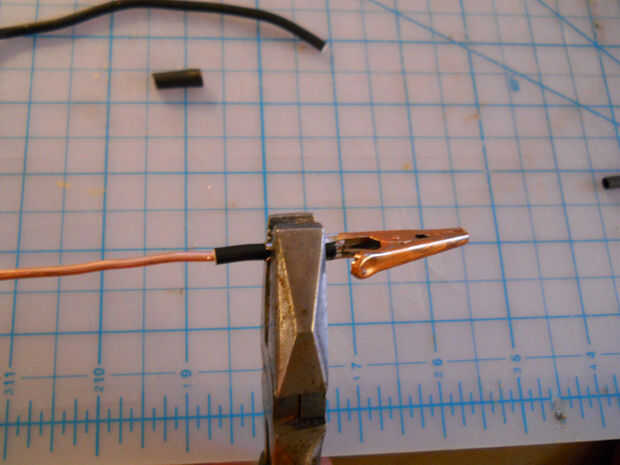 Para seguir con el tema de steampunk, decidió pintar las pinzas de cocodrilo con una pintura metalizada oro. He utilizado un punzón para ampliar un poco la base de los clips, empujando la lezna hasta que la base afloja un poco, luego unas pinzas para apretarlas firmemente en el extremo de los cables