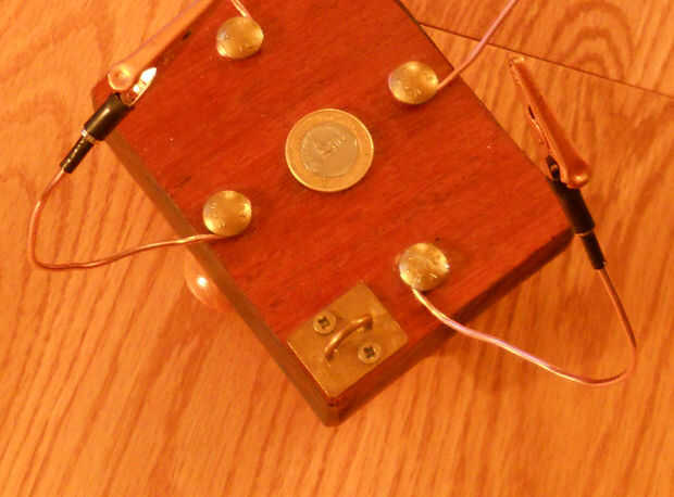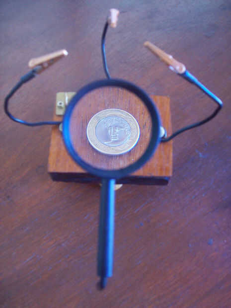 También decidí pegar un plata y latón brasileño una real moneda al centro del bloque de madera, exclusivamente para la decoración y darle esa llamarada adicional brasileño "Vaporpunk" ;-) Es una moneda de aspecto muy agradable, como se puede ver en la segunda foto de arriba. (Esta foto fue tomada antes de había pelado de los cables y había añadido la pintura oro).