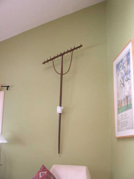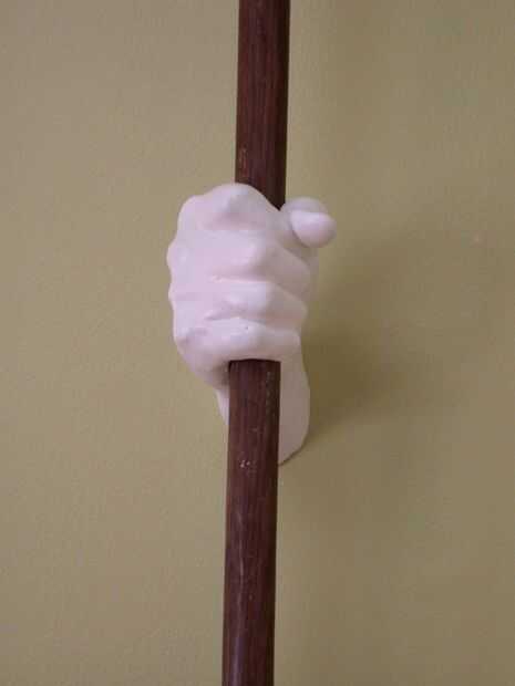 Los desafíos fueron (1) fundición lo que el agujero emparejados el uno es necesario para mantener el rastrillo y (2) colocar la mano de yeso en la pared de una manera que reveló sin ganchos u otros sujetadores.