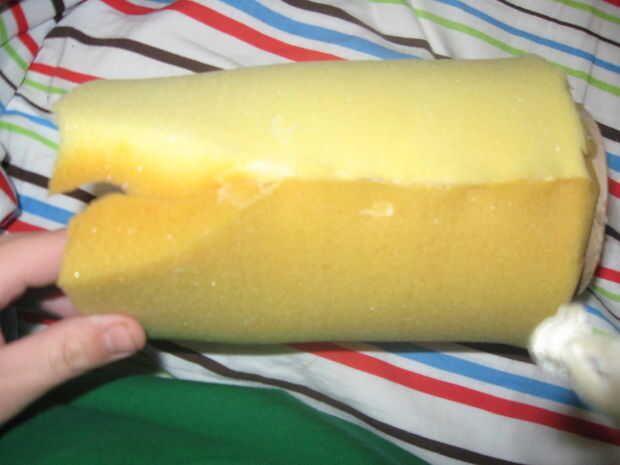 Tomar tu espuma cama y encontrar el patrón más gordo que tiene. Mina era ondulado. Poner el tubo en la espuma y enróllelo alrededor para ver cuánto usted necesita para cortar la espuma. luego ir sobre una pulgada o más, por si acaso y luego cortar. tomar tu espuma y pegamento ligeramente por debajo de la parte superior del tubo. péguelo en secciones pequeñas, manteniéndolo durante aproximadamente un minuto, para asegurar que lo pega al tubo de cartón. debe tener algo que se ve la primera foto hasta ahora. desea que parte un el extremo de ser arrastrado. esa parte va a subir bastante cerca de su codo. Ahora dar la vuelta en el interior y corte una capa poco, que se muestra en la segunda foto. el interior capa es aproximadamente la mitad del exterior. Utilice el pegamento caliente para pegan, haciendo el tubo completo. Ahora toma un patrón más de tu espuma. la flaca que tuve fue un montón de puntos si tienes ese golpeteo. corte todos los puntos para que sea mucho más fino. un enfoque más sencillo es ir a comprar espuma más fina. cortar del ancho deseado y el pegamento que a cada lado en el extremo del tubo, otra vez pegarlo en secciones. ignorar la pintura para más tarde.