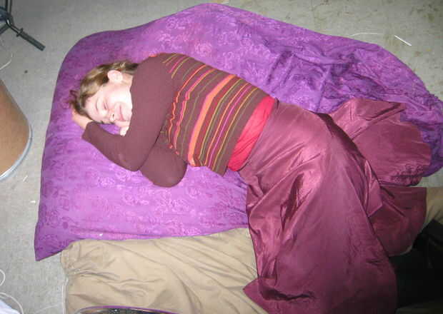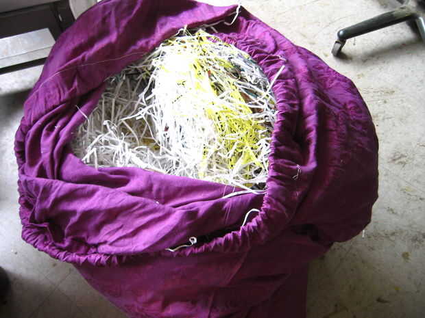 Para pruebas iniciales se utilizaron bolsas de lazo gigante. Para la comparación llenamos una bolsa con periódicos desmenuzadas para hacer una "cama de deformación". Las pruebas de Marion. CONCLUSIONES: Se necesita una gran cantidad de relleno para hacer un futon. El crumblebed es grumosa, no tan buena como la cama de desmenuzar. La cama de desmenuzar es muy cómoda. Marion acababa de terminar uno de sus exámenes finales y tomó una siesta allí.