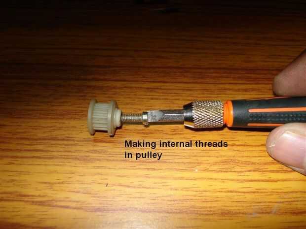 tomar el nylon polea y tratar de crear threads.for interna esta u no necesitan cualquier spl. Tools.Take 3mm tornillo y apretarla en el polea con poca force.as la polea está hecha de nylon, hilos de rosca internos se creará por eso screw.now de 3mm, desenroscar y fijar firmemente el tornillo de montaje.