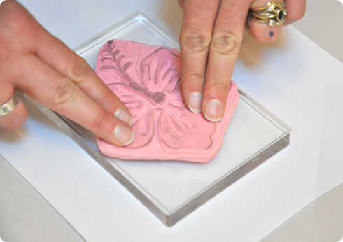 Para la flor más pequeña utilizamos un sellado bloque de acrílico con el pegamento Tack n ' Peel para hacer más fácil el sellado. El hace claro bloque fácil de ver donde se colocan las cosas y cuando termines el sello puede ser halado para poder usar el bloque con otro diseño.