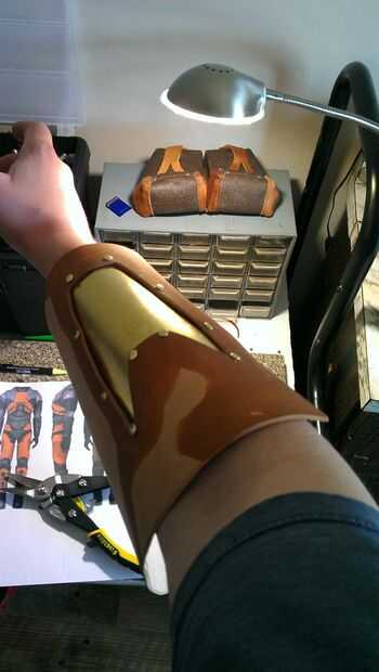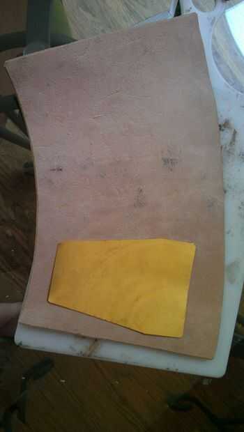 Si desea agregar un recuadro de metal, ahora es el momento. He utilizado una hoja de latón de 24 calibre para los míos. puede obtener 4 por 10 hoja de cobre amarillo del pasillo de la manía. nada más grande que tendrá que solicitarse en línea. Corte la forma que desee desde su espacio cerca de la orilla (borde izquierdo si se va en su brazo derecho, derecha borde si va en el brazo izquierdo) y coloque el bronce detrás de él. globo ocular de la hoja de cobre amarillo y cortar una porción hacia fuera aproximadamente la mitad una pulgada más grande que las dimensiones de su inserción. tijeras de trabajo mejor para esto. después de esto, use un agujeros de golpe a golpe de cuero a intervalos equidistantes alrededor del recorte de cuero. doblar su inserción de metal alrededor de un poste o una barandilla de algún tipo, y luego Envuelva el cuero sobre él con el orificio centrado encima de. Utilice un marcador permanente para marcar en el recuadro de metal a través de los agujeros en el cuero. a continuación, utilice un metal de golpe a golpe estos agujeros a través del metal. debe hacerse después de que el metal está doblado alrededor de un objeto curvo o el cuero se combará. Asegúrese de que los agujeros coincidan antes de pasar.