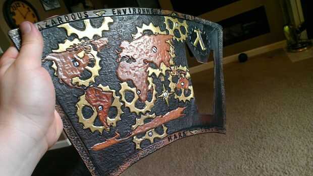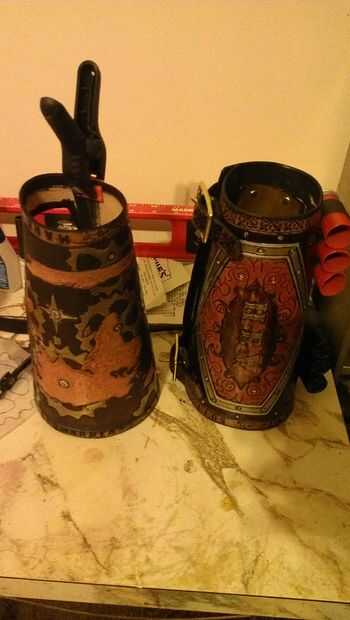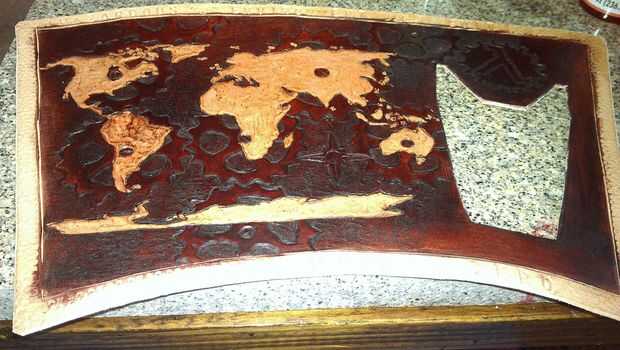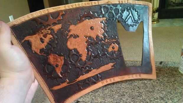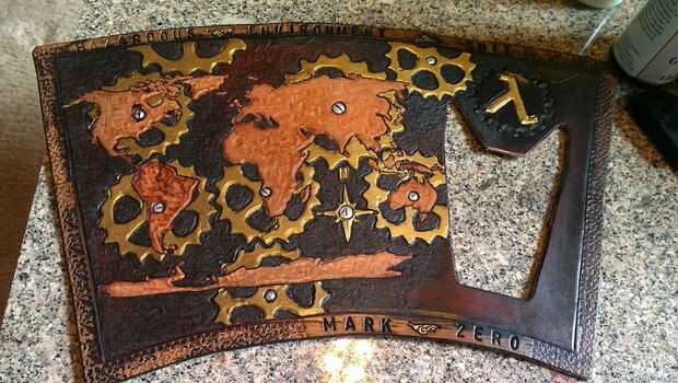 Ahora que tus herramientas se realiza, es tiempo para teñir! para este proyecto que he aplicado un base de acrílico resiste a las partes de mi piel que quería destacar y deje que se seque, y luego cubrió toda la pieza con gel caoba antiguo. dejarlo reposar unos minutos entonces que pulir la mierda fuera de él con un paño de algodón viejo. una vez que hubo terminado, tomó algunos Goma tragacanto había aplicado a todos los bordes y pulirlo liso con una rueda de borde impermeable. no tienes que hacerlo si no quieres, pero da a la pieza un borde acabado agradable. después de teñir y slicking, apliqué shene super eco-flo a toda la pieza y dejar secar. luego usé un lápiz de pintura sharpie metálico Oro para ir sobre los engranajes. es importante aplicar el metálico después de la super shene para evitar decoloración. que seco, entonces uso de remaches y un setter del remache y una losa de mármol o incluso su garaje piso y poli maza para fijar los remaches para unir su inserción metálica.