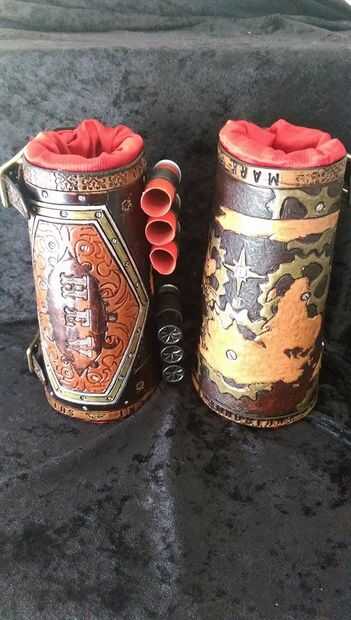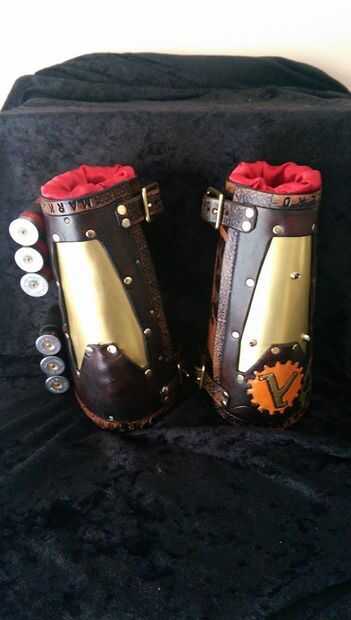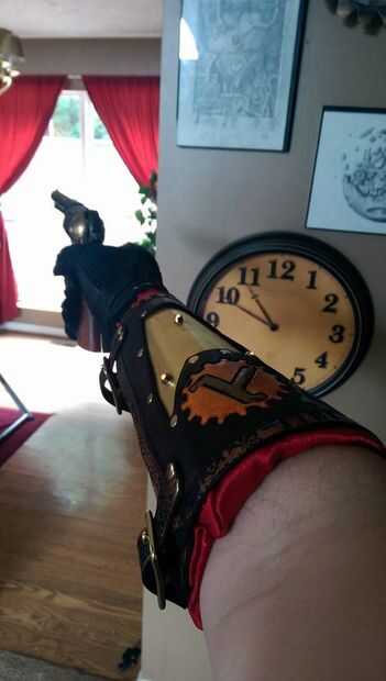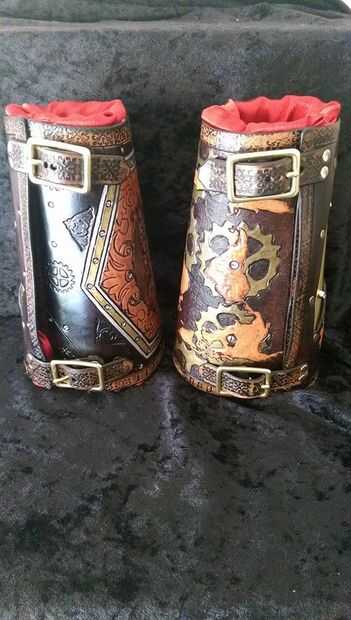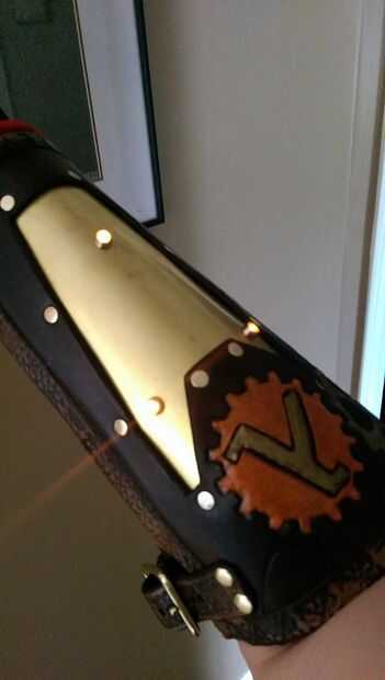 bueno, fue mucho trabajo, pero no haya terminado todavía. ahora es el momento para colocar las hebillas y correas y acolchado. Yo empezaría con las correas. tomar las hebillas que utilizas para sujetar los brazales y medir el interior ancho. hacer un par de correas de 5 pulgadas de largas y tan anchos como la parte interior de sus hebillas. usé 1 pulgada centro bar hebillas en mi proyecto, porque le impide tener que adjuntar guardacorreas. bisel y las correas de la estampilla si usted desea y luego perfore agujeros hacia abajo en el centro de las hebillas. teñirlos y capa con shene super. Luego perfore agujeros para fijarlos en el bracer y fíjelos con remaches. os adjunto mío al borde más cercano a la inserción de metal. para los titulares de la hebilla, cortados una porción de cuero ligero aproximadamente 2,5 pulgadas x la anchura de su hebilla, usan un punzón oblongo a Perfore el centro de este doblez en blanco, se la mitad y golpe un par de los agujeros para remaches en el exterior. entonces adelante y lo mancha sellar y doblar sobre su hebilla. determinar dónde colocar las hebillas envolviendo su brazal en el brazo y luego colocar la hebillas a medio camino entre lo que se sentiría tensa y suelta, marque los puntos punzonado de agujeros para sus holers de hebilla. seguir adelante y tinte y sellarlas, luego remache para su sujeción. Ahora tienes un bracer completa. Si usted desea agregar relleno, cubrir unas tiras de espuma medidas al ancho de su sujeción con la tela de su elección, utilice fabri-tac o algún otro adhesivo permanente para sujetar en las fronteras. Tenga en cuenta esto afectar el mobiliario, así que asegúrese de probar el relleno hacia fuera antes de fijar permanentemente.