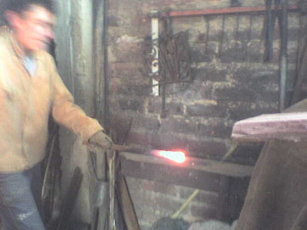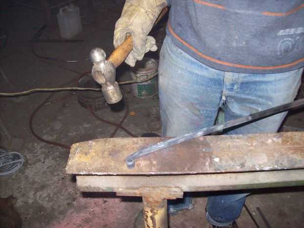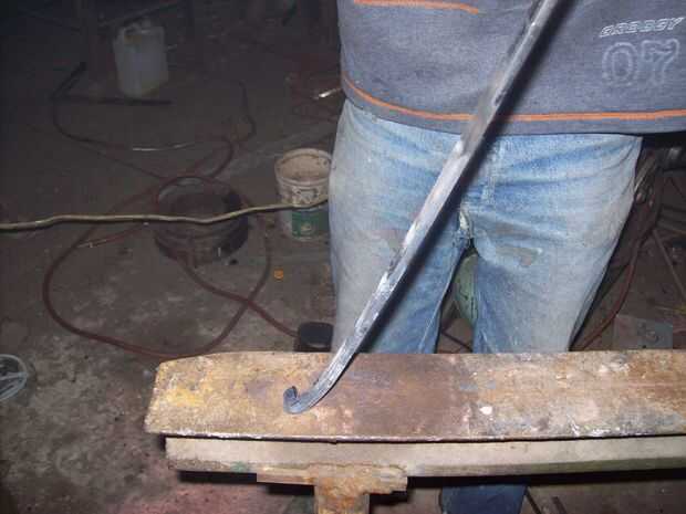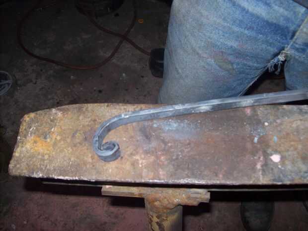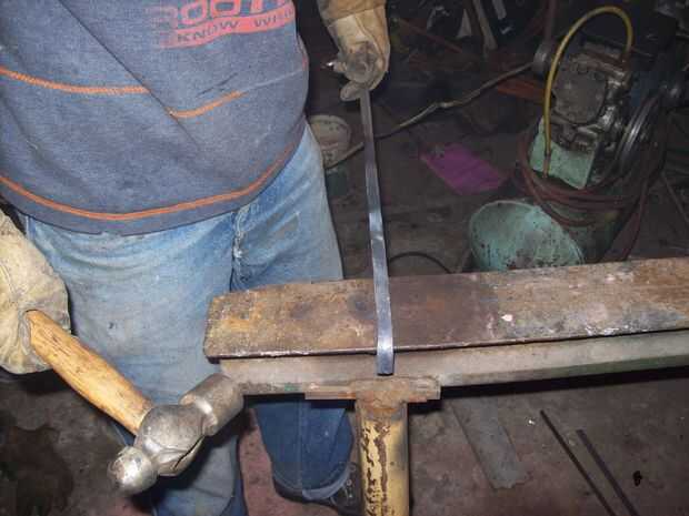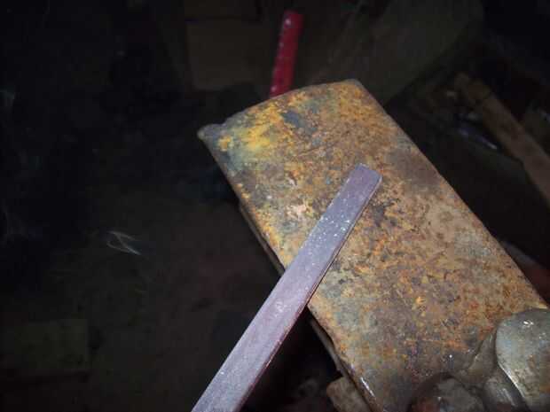 Empieza a calentar en la fragua el hierro hasta se pone rojo cereza, martillo la punta de la plancha y alisar un poco. Encontrar la mejor forma de hacer these.there son algunas técnicas, pero sin duda soy apenas un novato en este tipo de Crafts.Personnally no me gusta usar remplates para doblar la plancha de calor.