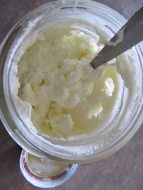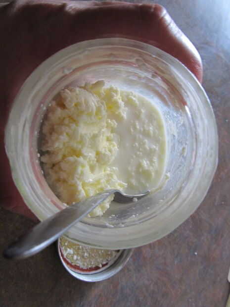 Cuando era un niño la transformación mantequilla pasó mucho más rápido. Creo que es por el uso de la leche cruda. La crema procesada es un poco más difícil trabajar con. Con leche cruda la transformación tarda unos 15-20 minutos. Con la crema comprada me tomó unos 35 minutos a mano. Con varios descansos para descansar mis brazos. ¡ Olvídate de comprar una de esas pesas shaker en T.V.! Hacer mantequilla con la mano! Mi conclusión fue... Si usas uso crema tienda compró una batidora en lugar del método de frasco!