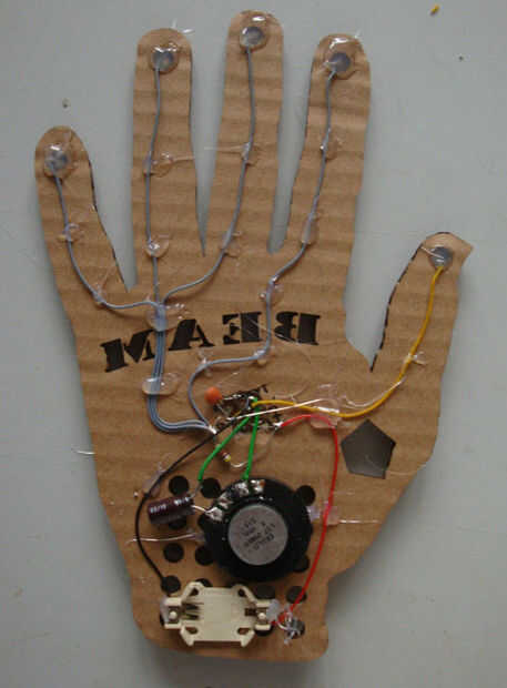 Si tocas el pulgar y uno o más de los contactos metálicos en la punta de los dedos y luego te la dio empate característico sonido! (Los gritos significa que usted no debe desaparecer pero siguen muy de cerca "en contacto" :-) Es un adiós anti screaming mano :-)