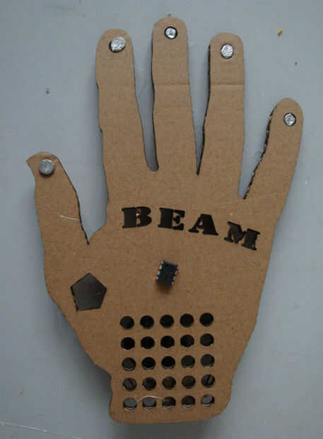 Se trata de una fantasía sobre el drawdio. La forma se hace usando un cortador láser pequeño. La 555 viruta es encima de la superficie de la mano, el resto de los cables en la parte trasera. Puede adjuntar la mano adiós a una superficie metálica con el imán del altavoz pequeño en la parte posterior.
