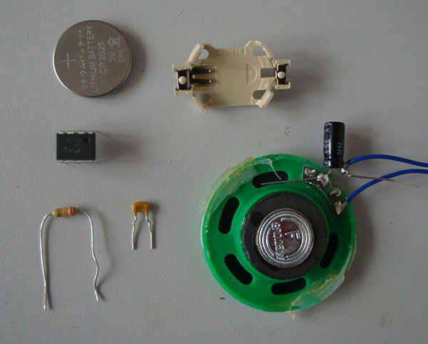 Usé una batería de 3V, para un sonido bien suave. Si usted quiere un grito real, aplicar más tensión, el 555 puede soportar hasta 15V (pero ten cuidado con las orejas!)