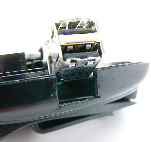 Cortar un cuadrado en el lado del caso dynamo el tamaño de su puerto USB. Puede calentar la hoja del cuchillo que podría hacer más ordenado y más fácil. Presione el puerto USB en la toma que hizo para ella y pone un poco de pegamento, si es necesario para mantenerlo en su lugar.
