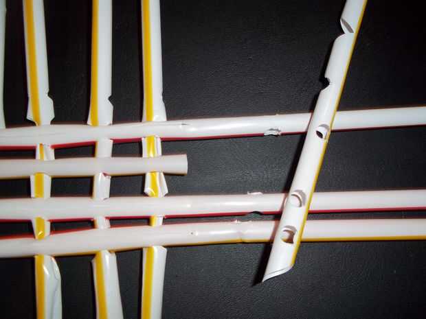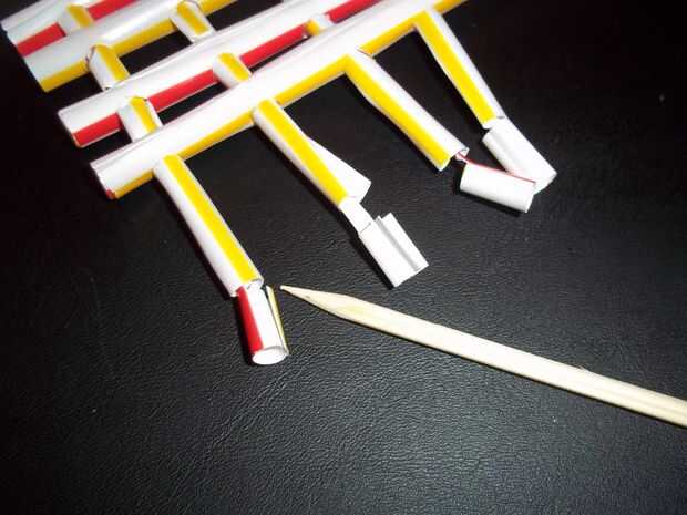 También en la foto es la brocheta de madera opcional. Esto puede usarse para empujar dentro el dedo y volver la paja a su forma de tubo normal si la prensa era excesivo. No te preocupes de tener que parecer perfecto. Todo lo que es importante es el libre movimiento del tendón dentro del tubo de la palma. Si se puede mover libremente y los dedos están alineados alrededor de la uña, se han montado correctamente.