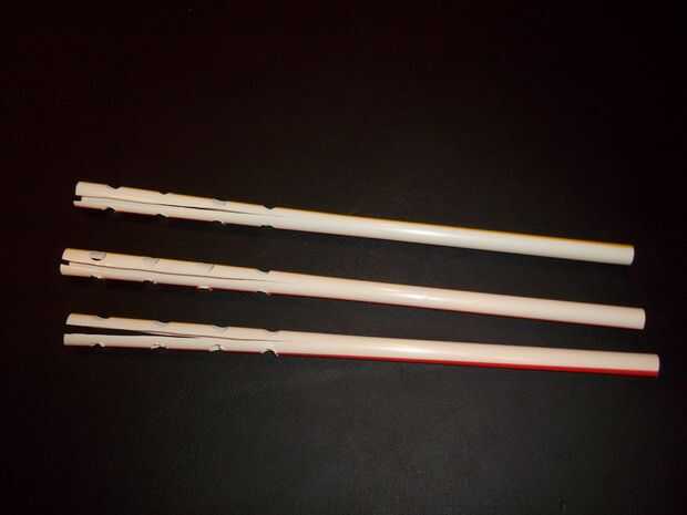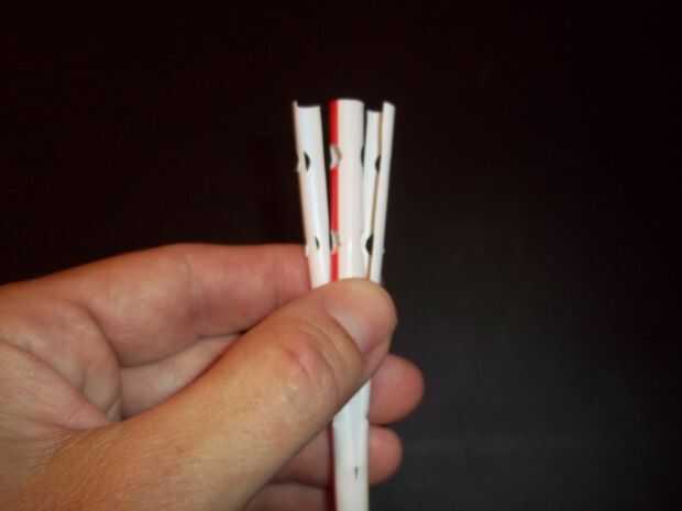 Para cada una de las tres pajas, perforar cuatro agujeros en la misma ubicación exacta como los orificios de la palma. Con mucho cuidado corta la paja a la mitad entre los agujeros y dejar aproximadamente 1/4 de pulgada más allá del último hoyo.