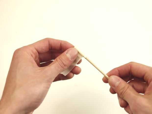 Corte dos pedazos de 1/2 pulgadas de paja. Envuelva la cinta alrededor del extremo de un pincho y enrosque el cubo redondo los granos y los pedazos de paja sobre ella como se muestra. Envuélvalo con cinta al otro lado y corte el sobrante.
