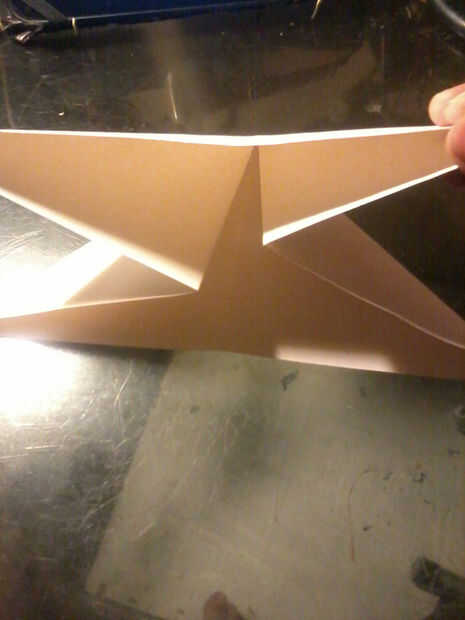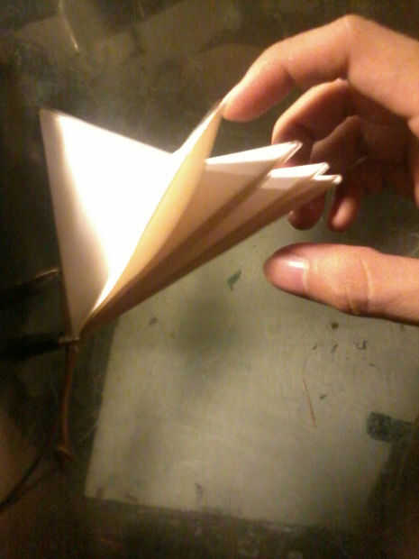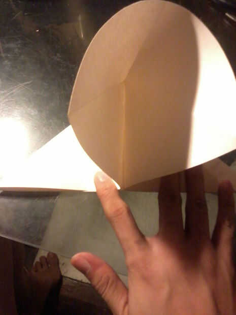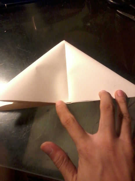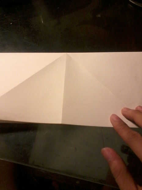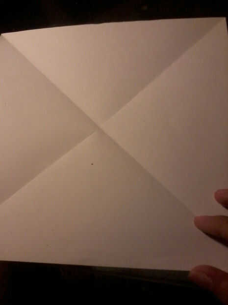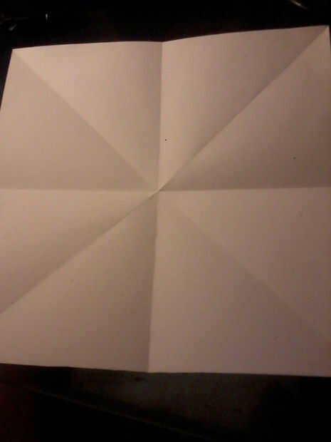 En el pedazo de papel hacer un doblez en diagonal como se muestra arriba en la primera foto y doblar por la mitad, entonces se verá como la siguiente imagen como se muestra arriba.
