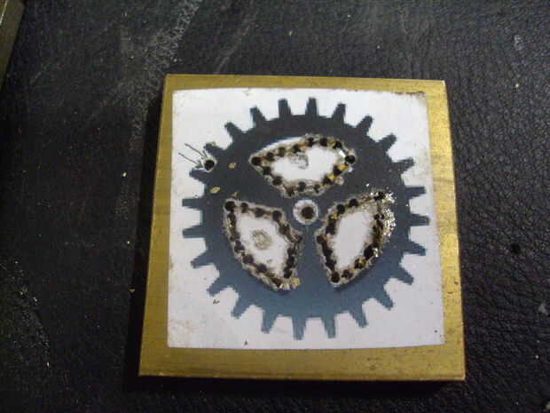 hacia "remoción de material" Empecé agujeros numerosos a lo largo del interior borde de stensil donde quería quitar para crear los rayos de engranaje. Usé un poco de una decimosexta. bits más pequeños menos presentación, mayor poco más presentación. Usé un taladro en dos de las aberturas del triángulo y un taladro en la tercera apertura y un taladro de mano en el interior de cada diente. Usé los 3 ejercicios diferentes para demostrar a mi mismo que incluso uno con herramientas limitadas puede hacer que estos engranajes.