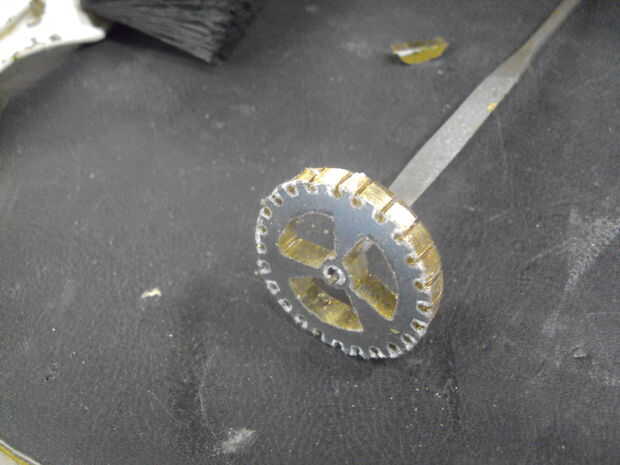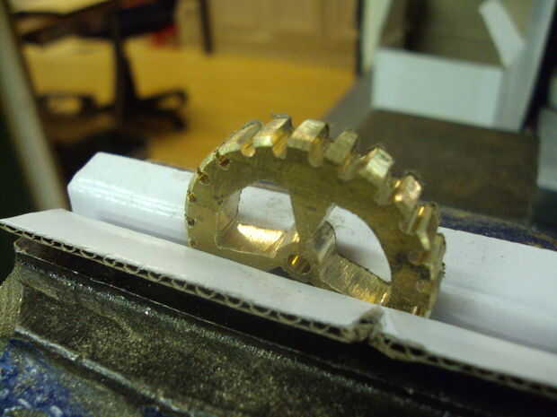 el latón redondo trozo O he creado en mi mordaza de sujeción, quiero hackear Sierra ranuras desde el exterior a los agujeros previamente perforado para los dientes del engranaje. con una variedad de archivos de la aguja o joyeros archivos su tiempo para terminar en algo que parece un engranaje. medio redondeos archivos, archivos planos pequeños y triangulares archivos son las que usé. Tómese su tiempo aquí, presentación demasiado rápido puede desprender demasiado material y obstruir sus archivos porque el latón es blando. Tenga en cuenta que presentar en las esquinas de las aberturas con un archivo de varios lado archivo dos superficies a la vez y cambia la forma si usted no es cuidadoso.