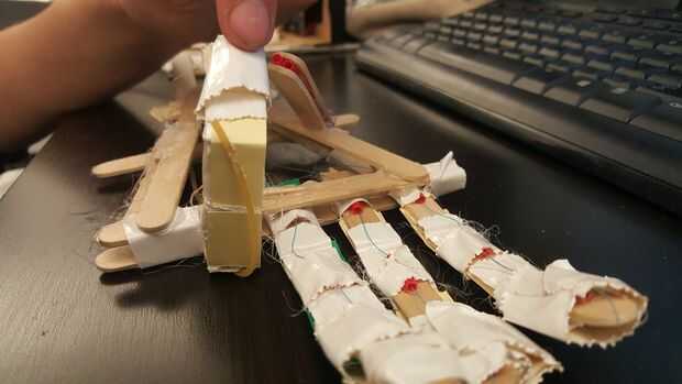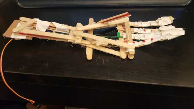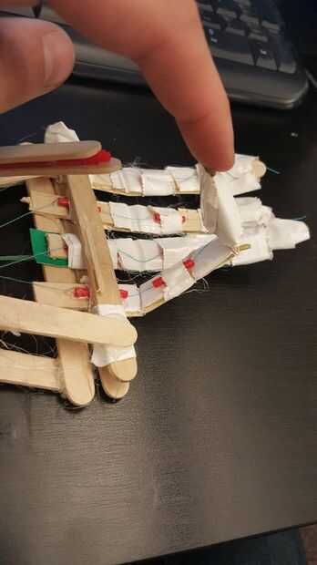 Finalmente ejecute el hilo entre las piezas de Palma dos triángulo y la muñeca. Para construir la muñeca hice dos rectángulo pequeño y luego pega el servo pequeño entre ellos por lo que se podría conectar al hilo. Usé pajas como marcadores de posición para el resto del rectángulo. Luego pegué la muñeca en la parte inferior de la palma.