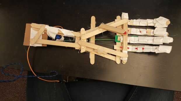 Para la construcción física de este mano construir la palma. Lo hice haciendo dos triángulos con palitos y pegamento caliente. Entonces comencé a construir los dedos (que eventualmente se pegan entre los dos triángulos. Cada dedo era construir el mismo, con la única variación la longitud. El pulgar no se mueve en mi diseño y es simplemente una paja con palitos calientes pegados a los lados, montados en un ángulo de 45 grados desde la palma.