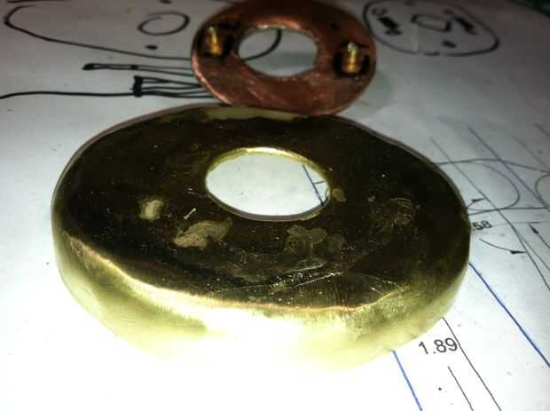 La placa de respaldo para la muñeca es luz placa (alguna hoja pesada) alguna lámina de cobre y latón. Los huesos de la muñeca se perforaron y roscado y roscado barra puesta en se y luego la placa de cobre fue agregada y soldada con una buena soldadura de plata baja. Que placa es entonces atornillados a lo más pesados latón 'cup' que se unirá a la toma de corriente cuando se realiza el proyecto.