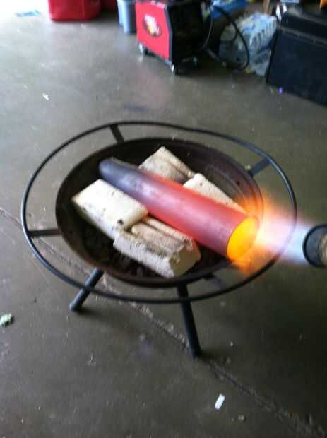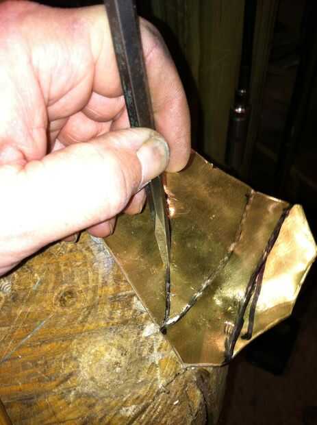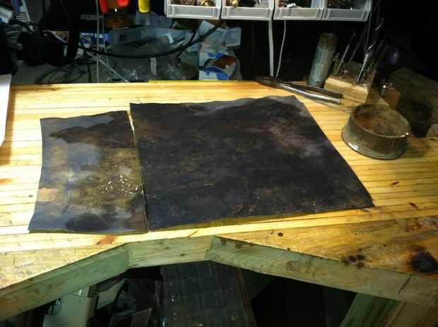 Para hacer la piel. Empecé con una carcasa de vintage 90 m m artillería cáscara. Me corte el fondo de él y cortan formas largo. Después de eso tuve que recuecen para que me permitiría aplanar hacia fuera.