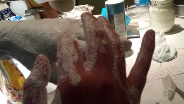 El siguiente paso que hicimos fue envolviendo el modelo en yeso vendas. Para obtener como resultado una mano. Lo que nos permite integrar un mecanismo de acaparamiento en la mano. El mecanismo que hemos elegido para este ejemplo fue un garra de residuos ordinario.