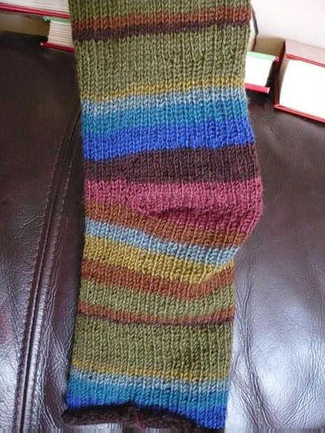 Muestra cómo pude un talón yendo hacia atrás y adelante entre la parte recta de la D (doble vuelta) una vez para cada completo ronda. Así que voy a mi alrededor una vuelta y cabeza hasta la parte recta de la D. Utilizar esto como mi punto para dar marcha atrás e ir en cuanto a la parte inferior de la parte recta de la D y luego vuelta y vuelta la parte recta. Luego continúe alrededor y repita este paso hasta llegar un talón suficientemente grande como para acomodar su calcetín.  Hice esto sobre todo en la red y luego continuó unas filas en el marrón oscuro hasta el final del talón al tamaño correcto.  Lo probé un par de veces hasta que conseguí la mirada justa en la fibra. Se puede practicar haciendo un giro de talón antes de comenzar un calcetín entero, aunque sería mucho más rápido hacer un calcetín de tobillo. Podría haber conseguido un par de Tobilleras de una bola de hilo. Desde que tuve dos, decidí ir para calcetines de la rodilla porque me encanta usarlos con mis jeans.