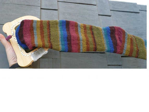 La segunda (2) foto muestra cómo el calcetín estaba utilizando sólo ampliado adicional las clavijas agregar uno en cada otra clavija vacía al espacio hacia fuera. La tercera foto (3) es por lo que se puede ver mejor el tejido y que tengo las clavijas en la mayoría de los agujeros terminando cerca de la parte superior.  He guardado algunos marrón oscuro para terminar el dedo del pie. Yo sólo puedo coser el dedo del pie cerrado, pero si está un poco apretado, voy a crochet más al extremo con el hilo correspondiente.  (Más fotos por venir)