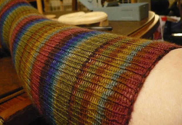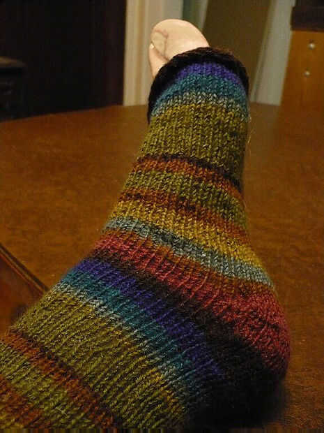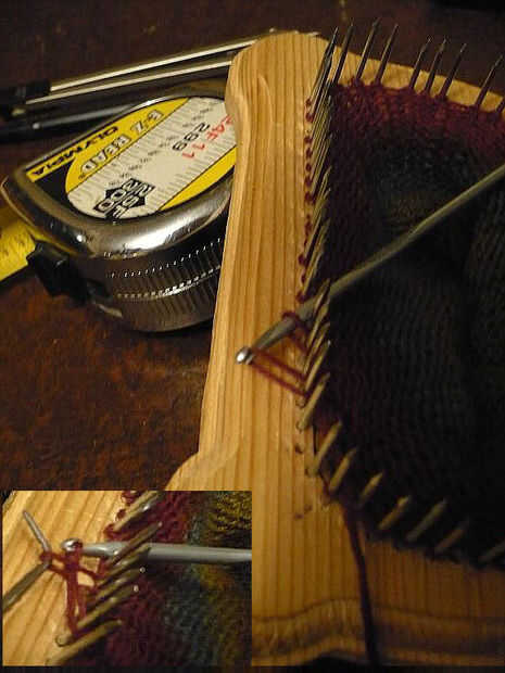 Terminé de la parte superior levantando los lazos individuales de las clavijas a los de ganchillo juntos.  Levantar el primer lazo con el gancho telar lo suficiente para poner a través del gancho de ganchillo. Luego tomar el hilo y tirar a través (hilo largo) recoger el siguiente bucle con un segundo gancho y el lazo desde el primer gancho del gancho agarrador y ponerlo a través. De esta manera hay un lazo nuevo entre cada uno de los lazos del telar y el calcetín no será apretado alrededor de mi pantorrilla de rodilla.  Salí de la última puntada no atada alrededor de la primera hasta que vi cómo encajan.