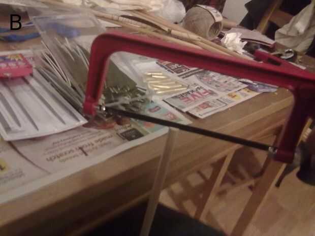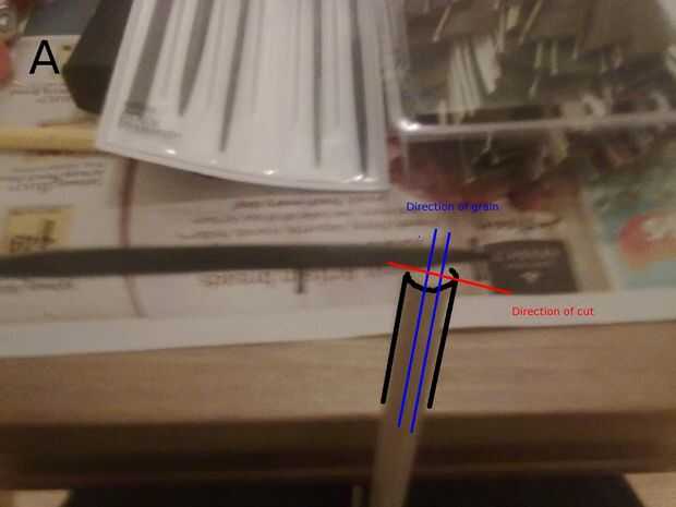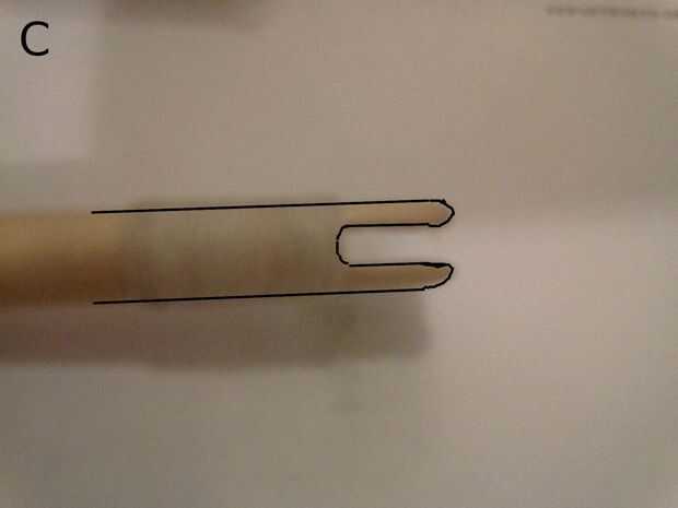 Para hacer esto que usted tendrá que utilizar su sierra para metales y archivo establecido. Sujete su flecha a su banco de trabajo. Con el archivo (yo usé el archivo triangular) presentar un surco arranque para su sierra para metales. Asegúrese de que es perpendicular a la dirección de la veta de su flecha. (A) después de eso, corta aproximadamente media pulgada con su sierra para metales. (B) utilizar archivos de hobby para ampliar el corte hasta que se ve como imagen C . Ignorar la cadena en la base del nock, que es un paso más adelante. Utilice el papel de lija para suavizar el nock, eliminar astillas o bordes ásperos y de la forma ligeramente cónica la entrada para hacer más fácil nocking.