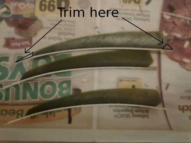 he comprado un paquete de 100, plumas de 5 pulgadas de Ebay para $30 enviado. Esto es suficiente para 3 docenas de flechas. Nos va ser ligeramente recorte las plumas antes de que les atribuimos a nuestros ejes. Sólo utilice su cuchillo para cortar alrededor de un cuarto de pulgada de las paletas . Corte las tiras solamente, quiere dejar la espina dorsal de la pluma para enlazar con el eje.