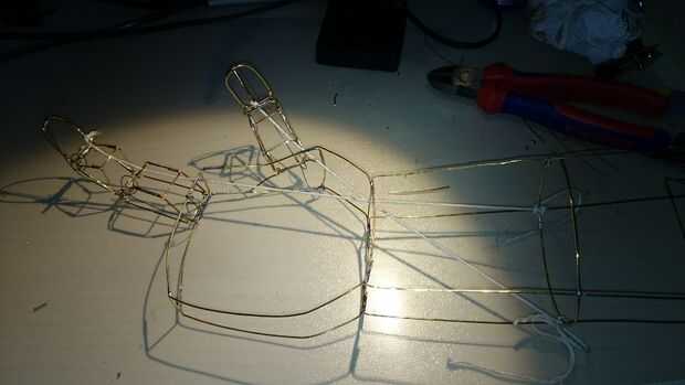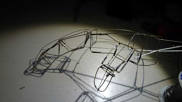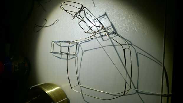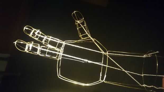 La mano y el brazo están hechos de alambre de latón, soldado con estaño. Los resortes se fabrican con alambre de piano, y los "tendones" están hechos de seda dental.