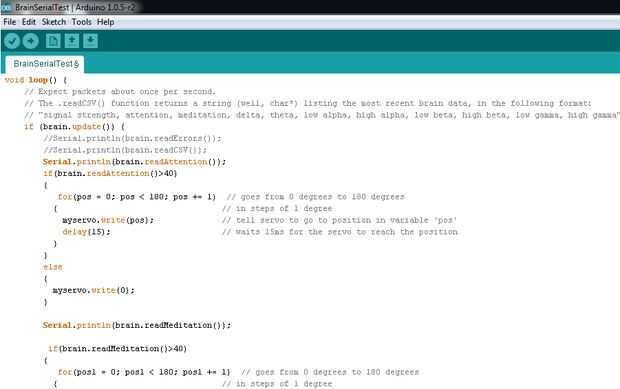 void loop() { // Expect packets about once per second. // The .readCSV() function returns a string (well, char*) listing the most recent brain data, in the following format: // "signal strength, attention, meditation, delta, theta, low alpha, high alpha, low beta, high beta, low gamma, high gamma" if (brain.update()) { //Serial.println(brain.readErrors()); //Serial.println(brain.readCSV()); Serial.println(brain.readAttention()); if(brain.readAttention()>40) { for(pos = 0; pos < 180; pos += 1) // goes from 0 degrees to 180 degrees { // in steps of 1 degree myservo.write(pos); // tell servo to go to position in variable 'pos' delay(15); // waits 15ms for the servo to reach the position } } else { myservo.write(0); } Serial.println(brain.readMeditation()); if(brain.readMeditation()>40) { for(pos1 = 0; pos1 < 180; pos1 += 1) // goes from 0 degrees to 180 degrees { // in steps of 1 degree myservo1.write(pos1); // tell servo to go to position in variable 'pos' delay(15); // waits 15ms for the servo to reach the position } } else { myservo1.write(0); } } delay(10); }