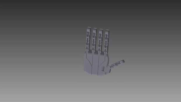 Este es el montaje 3D del proyecto y representa lo que se supone que para cuidar como se imprime. Hay 5 componentes principales de este diseño en 3D. La primera y principal parte es la palma, que alberga todos los dedos y rieles para cada tendón. La segunda es la parte más inferior del dígito para los dedos índice, medio, anillo y pinky. La tercera es la parte inferior de la cifra para el pulgar, que requirió múltiples representaciones para encontrar el ángulo ideal de rotación. El cuarto y quinto, común entre todos los dedos son las partes media e inferior de las cifras de todos los dedos. Cada parte fue diseñado con el fin de reproducir el movimiento natural de la mano y hecho ser tirado por un tendón de nylon en la contratación y ser tirado hacia atrás por bandas de goma durante la retracción.