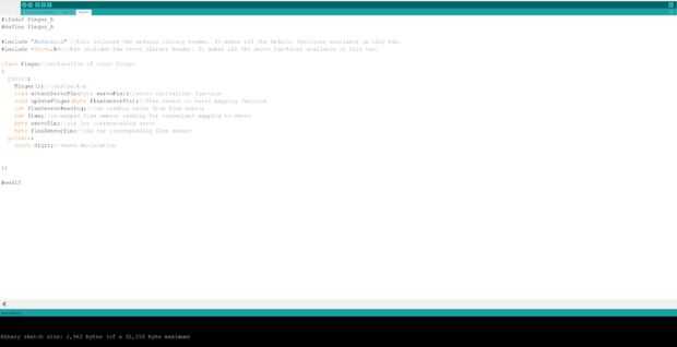 El archivo de encabezado de clase dedo contiene todas las declaraciones asociadas con la clase. Se declaran los pines flexSensorPin y servoPin y el número de servo, junto con la variable flexSensorReading que contiene la asignación de las lecturas de resistencia cruda de los sensores de flexión. La flexión variable contiene la asignación de flexSensorReading asignado a un parámetro más ágil. También se declaran las funciones attachServoPin y updateFinger. El constructor está presente sin un parámetro simplemente para permitir que la declaración de los objetos.
