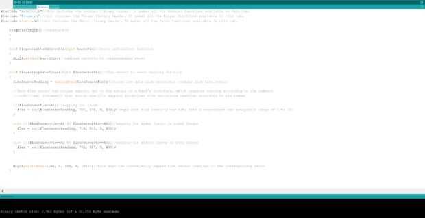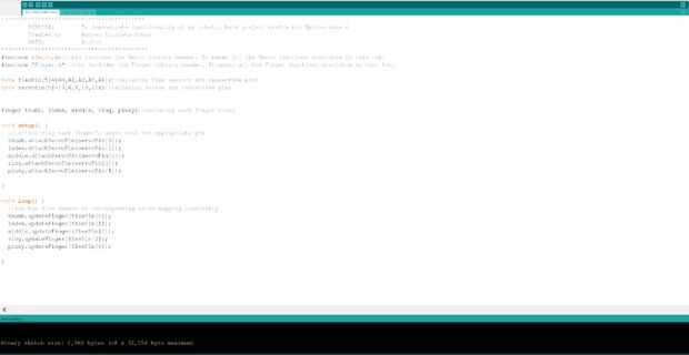 En el archivo principal de lo sketch de arduino, cada uno de los sensores de cinco flexión se asignan a entradas analógicas 0 a 4 mientras que los servos correspondientes se asignan a los pines analógicos en el lado digital 5,6,9,10 y 11 respectivamente. Como se puede ver, el archivo principal declara objetos pulgar, índice, medio, anillo y basado en la clase, el dedo meñique. En la función de la configuración, cada objeto inicializa la función de inicialización de servo del dedo mientras que en la función de bucle cada objeto actualiza constantemente la posición de cada servo según lectura del sensor flex.