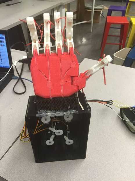 Gama del servo no es suficientemente ancha como para tirar un dígito entero, lamentablemente, así ampliando su gama es necesario. En esta ejecución, cada servo tiene otro eje servo atornillado sobre ella para ampliar su gama, aunque pueden utilizarse otros métodos. A continuación, pegamento caliente cada servo en un marco o caja. Posición de cada servo en la posición de 180 grados y pegamento caliente la mano a la parte superior del marco. En esta ejecución, se usó una caja, tener un agujero en la parte superior para el cableado de alimentación a través de. Ahora, ate cada tendón al servo correspondiente, asegurándose de que el dedo se contrae totalmente. Esto asegura el servo totalmente contratos como cuando desea alcanzar 180 grados.